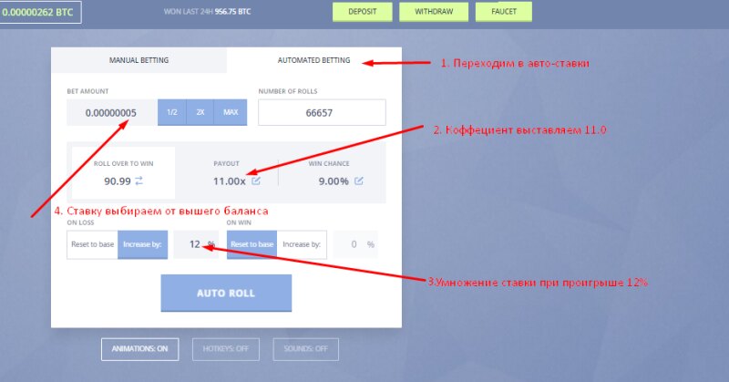 Приглашаем в первую и самую популярную игру на Bitcoin "КОСТИ" (Больше/Меньше) PRIMEDICE Отличное местечько , скоротать скучные вечера , или расслабится , в середине рабочего процесса ... --------------------- -------------- ------- ---- --- - -Казино работает c 2013 года -Более 20 миллиардов ставок -Средний вывод с проекта игроками 1400 BTC за 24 часа -Русский и Английский чат -Мгновенный вывод и пополнение счета -Контроль честности -Система достижений и Зал Славы -Функция авто-ставок И много другое .... Регистрация (партнерская ссылка): https://primedice.com/?c=Whitestar ------------------------------------------------------------ Немного статистики ребят с сайта Регистрация (партнерская ссылка): https://primedice.com/?c=Whitestar - Как получить бесплатные стартовые сатоши ?! - Стартовые сатоши можно получать не ограниченное количество раз , при условии , нулевого баланса. Делается это , очень просто: 1. В верхнем левом углу , нажимаем зеленую кнопку "FAUСET"2. Вводим капчу 3. На баланс упало 0.00000200 BTC (но для хорошей и стабильной игры , я бы советовал закинуть немного сатошей на счет) -------------------------------------------------- Несколько стратегий , для игры в казино: 1) Переходим в меню Авто-Ставки 2) Коффециент на победу выставляем 11.0х (шанс выиграть 9%) при победе наша ставка умножится в 11 раз 3) Умножение нашей ставки при проигрыше ставим всего 11-12% 4) Сумму ставки смотрите по вашему балансу. Некоторые ребята выставляют и по 0.5 BTC и по 1.5 BTC , минимальная ставка по этой страте 0.00000005 Вот так , она примерно работает:Чем больше минусов у нас подряд , тем выше профит Скрин показан как пример (баланс я бы советовал иметь не менее 0.002 BTC) Регистрируемся друзья, делим своими достижениями в данной теме Мои выводы с казино Мои контакты для связи ниже Пишите в любое время , готов ответить на все вопросы Jabber: Primedice@jabber.ru VIPole: Primedice41 -