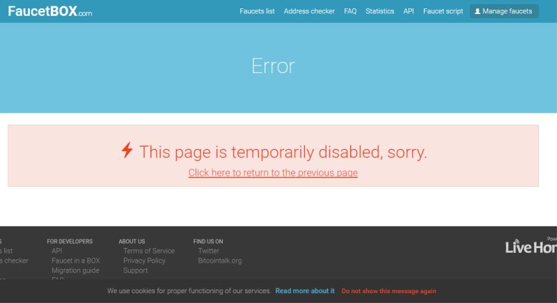 У faucetbox.com возникли некоторые проблемы. С утра этот сервис не работает. По началу обещали возобновить работы через 10 минут, однако прошло уже несколько часов, а "воз по ныне там".