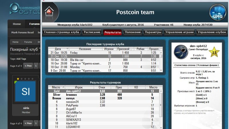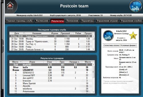 Сегодня в 19 00 по Мск ,состоится турнир. Призовой фонд составляет 1000 Postcoin. Призовые места распределятся следующим образом : 1-5 участников : 1 место 5-7 участников: 2 места ( 60-40% ) 7-12 участников : 3 места (50-30-20 %) 12-20 участников 5 мест (40-20-20-10-10 %) Условия : Необходимо выполнить одно из действий : 1.Вступить в группы "Вконтакте" и рассказать друзьям о клубе 2. Сделать ретвит данной записи : https://twitter.com/klarki1/status/793102727287074817 3.Отписать комментарий о нашем клубе в теме на : https://www.pokerstarter.online/forum/showthread.php?124787-Покерный-клуб-PostcoinTeam Без выполнения хотя бы одного из условий ,на призовые не претендуете.