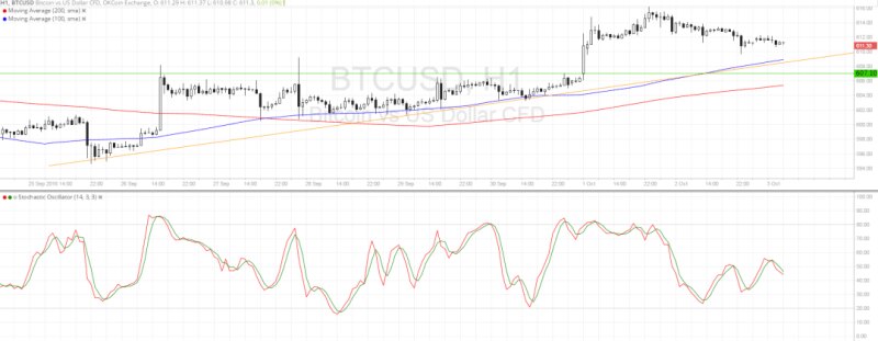 Стохастик, кажется, прокладывает путь вверх от зоны перепроданности, чтобы показать давление на покупку. Кроме того, промежуток между скользящими средними увеличивается, а следовательно бычий импульс становится все сильнее. В таком случае цена биткоина может сделать шаг в сторону недавнего максимума $616 и выше.