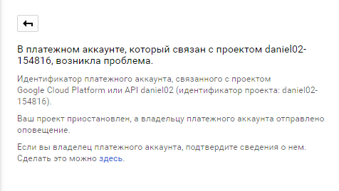 4. После подключения тестового аккаунта гугл пишет "включите оплату" и просит создать новый платёжный аккаунт.